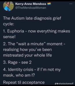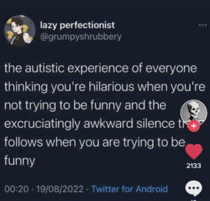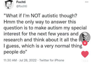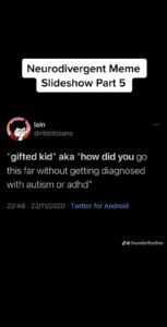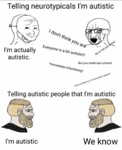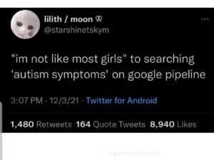 I’m screaming at a void of gender biases, cultural stigmas, and outdated diagnostic criteria that prevent early diagnosis. Me and every other late-diagnosed autistic female. I should’ve caught on sooner – several of my friends are also autistic or neurodivergent. Like the girls, gays, and theys, I guess we tend to naturally drift together or are grouped together by school systems, a la the “the gifted program” (Target in elementary school, Magnet STEM Academies/AP programs in high school – the gifted kid burnout to neurodivergence pipeline is so real.)