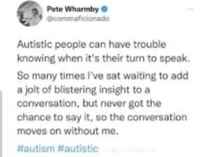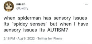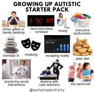 I acknowledge I have low support needs or level one ASD (previously called “high-functioning,” a misleading and harmful term), but this doesn’t negate the challenges I do face, they just might not be as apparent due to a variety of reasons (masking, gender, ethnicity). It’s a spectrum, after all, and not a linear one that leads people to falsely claim that “everyone is on the autism spectrum” but a radial spiked circular one like a color wheel, where everyone with ASD presents differently, and should receive accommodations as necessary. For instance, while I may not struggle as much with sensory processing issues or restricted interests and repetitive behaviors (I did more as a kid), I do struggle with social communication, executive functioning, and anxiety and mood disorders.